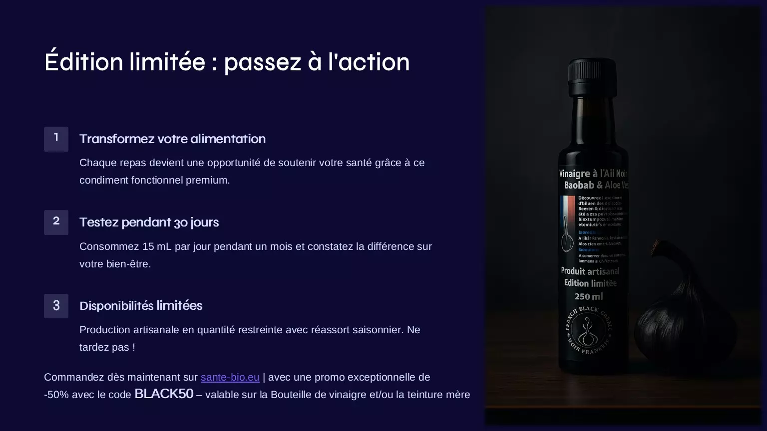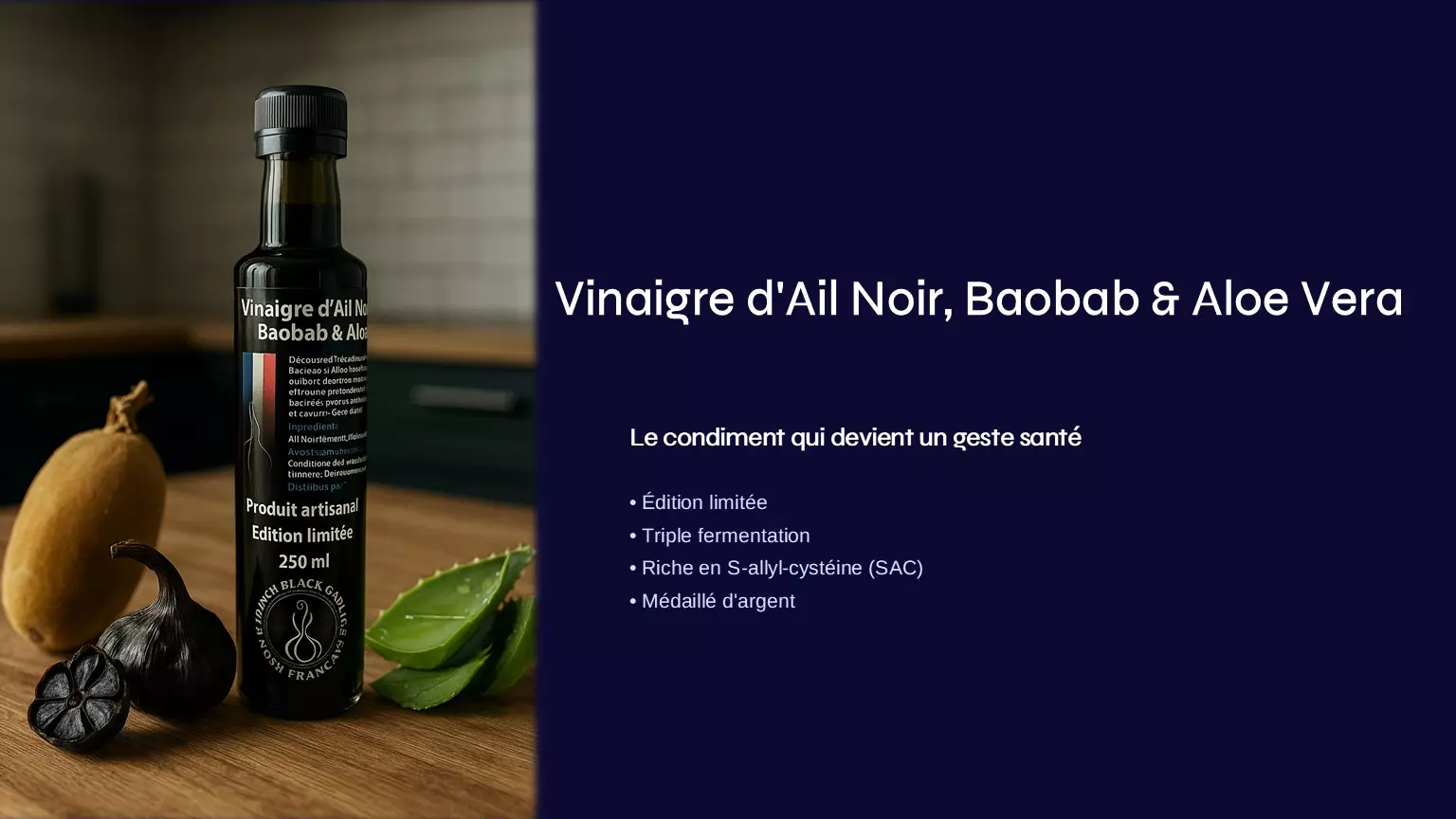notre vinaigre d’ail noir, baobab & aloe vera